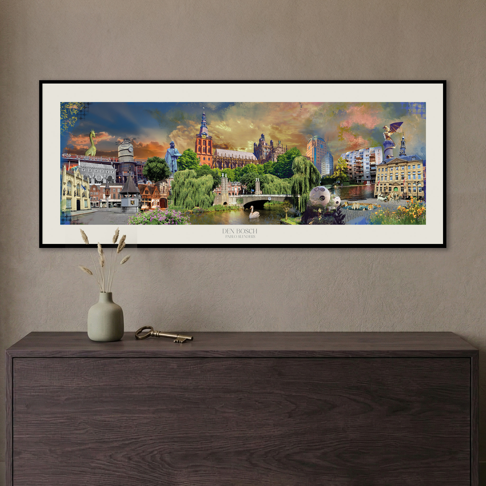 Voor jouw conceptstore koop je in één keer 10 kunstposters op hoge kwaliteit. Deze fotografisch kunstposter van Pablo Slenders, geïnspireerd op het uitverkochte origineel (het origineel is gemaakt met mixed media, collage, spuitverf en acryl). Deze kunstposter toont de skyline van Den Bosch in een unieke, artistieke stijl.